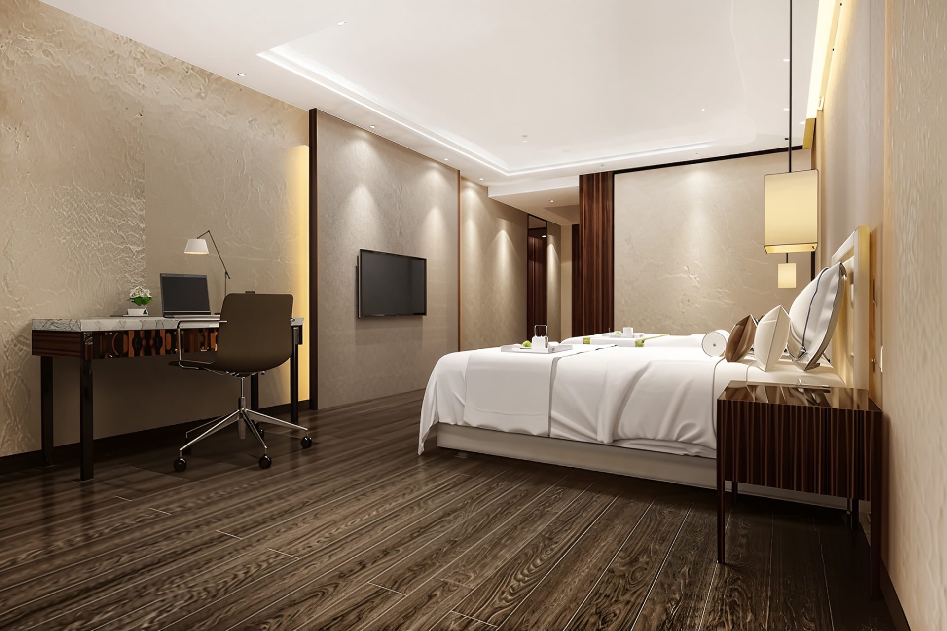 The elegant decor combines contemporary design with warm tones, creating a welcoming atmosphere. Unwind in the cozy seating area or step onto your private balcony, where you can take in stunning views of the city skyline or lush gardens.